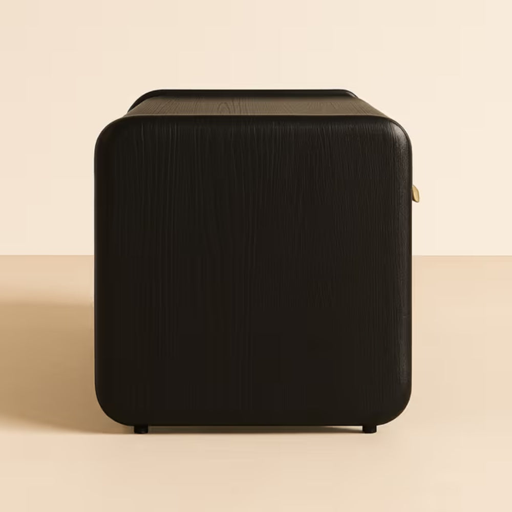 Elevate your living space with the Tatvaacasa Black Oak Media Console Table, a perfect blend of modern sophistication and everyday functionality. Designed with smooth rounded edges, a rich black oak wood grain finish, and accented with sleek brushed brass handles, this console brings understated luxury to your interiors.