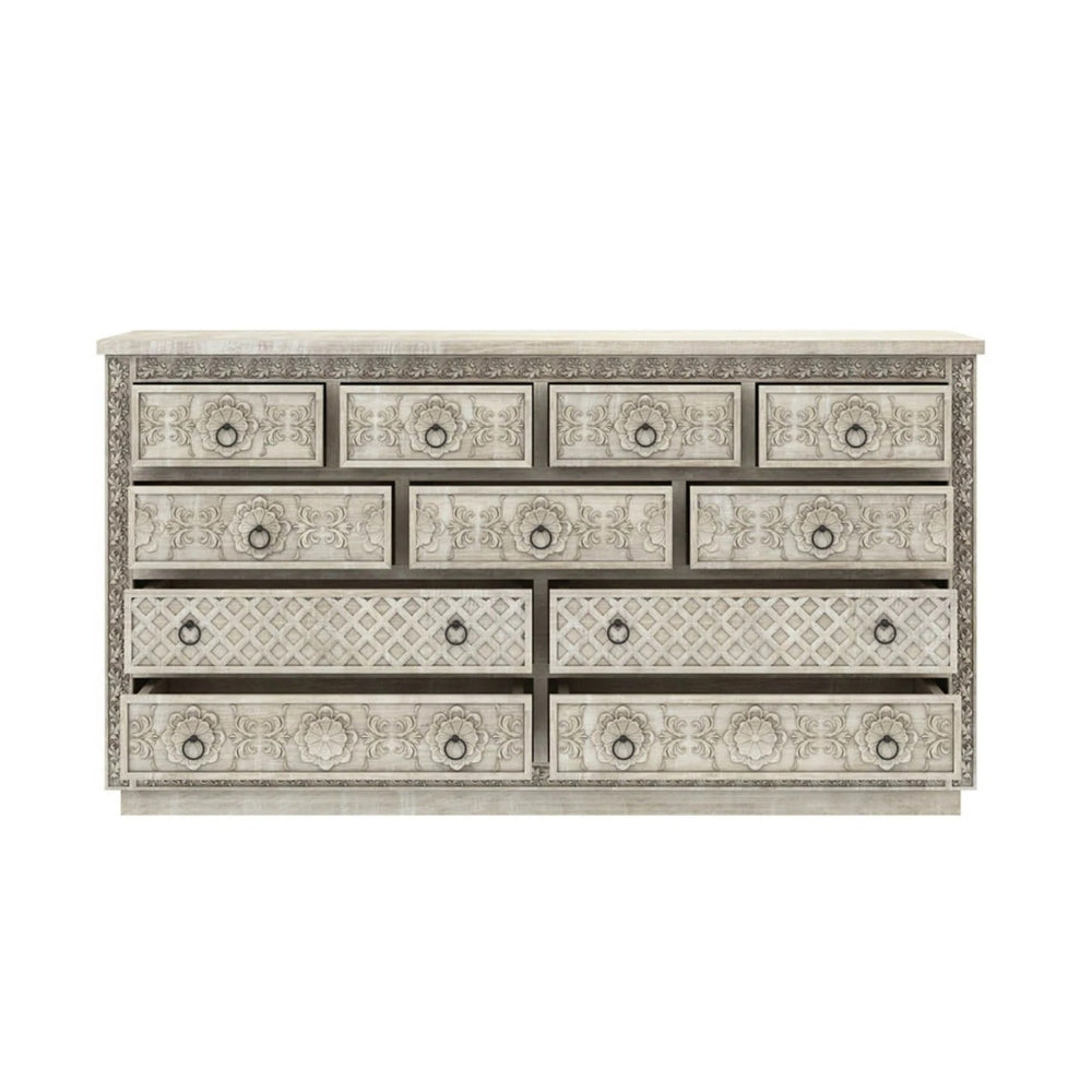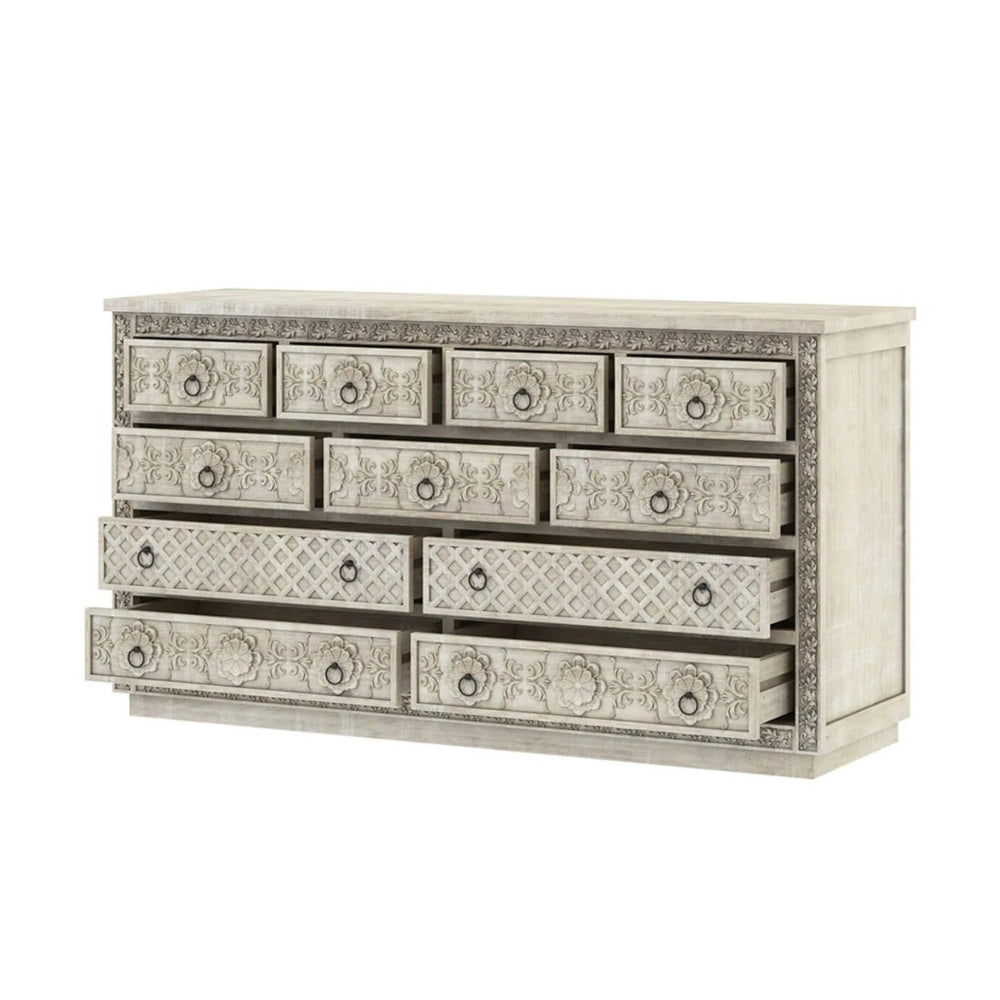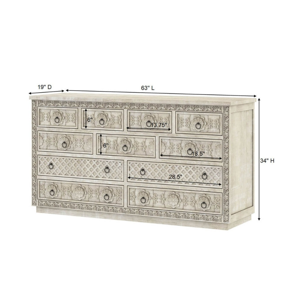 Finished in a distressed white tone, the chest highlights the natural grain of mango wood while creating a charming vintage look that blends beautifully with rustic, farmhouse, bohemian, and contemporary interiors. Its spacious drawers provide ample storage for clothing, linens, accessories, or household essentials, helping keep your space organized while enhancing the overall décor.