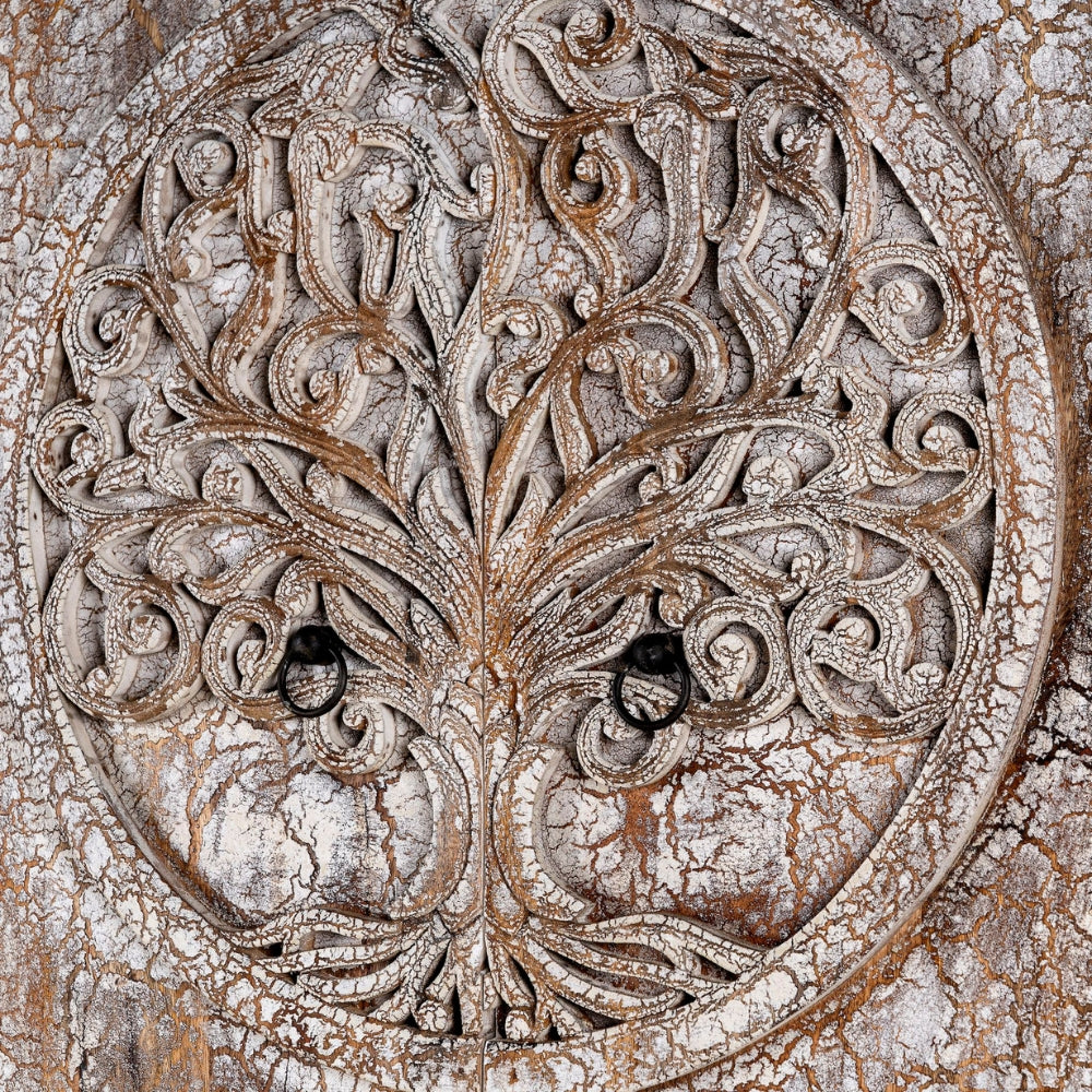 The highlight of this piece is the intricately hand-carved Tree of Life design, symbolizing growth, strength, and harmony. Finished with a three-layer distressed surface inspired by vintage coastal aesthetics, the wardrobe showcases subtle textures and tones that create a warm, bohemian character. Its design draws inspiration from Ibiza-style interiors, blending relaxed coastal charm with artisanal craftsmanship.