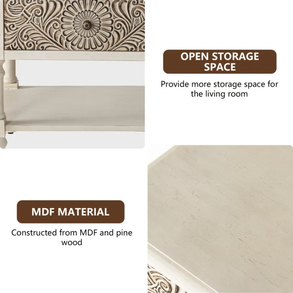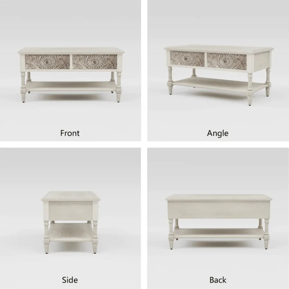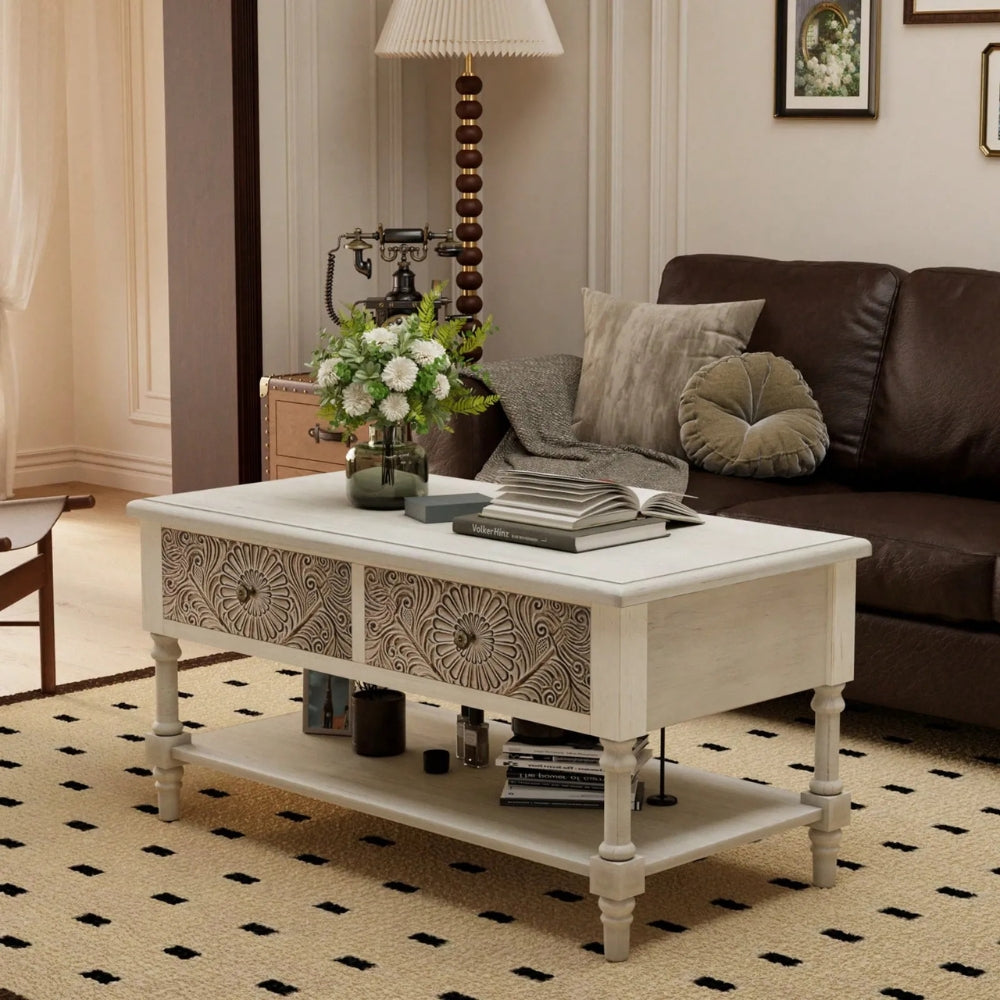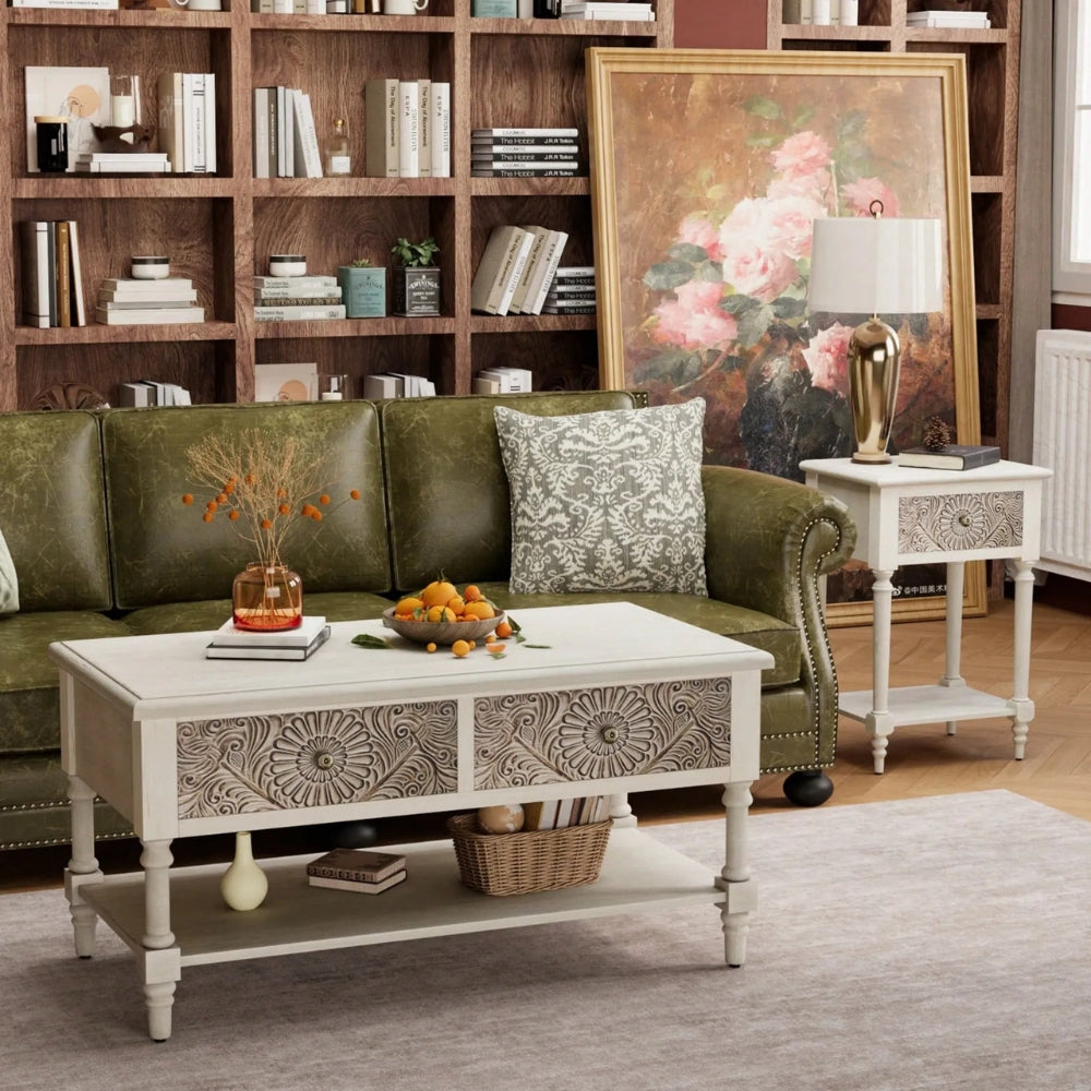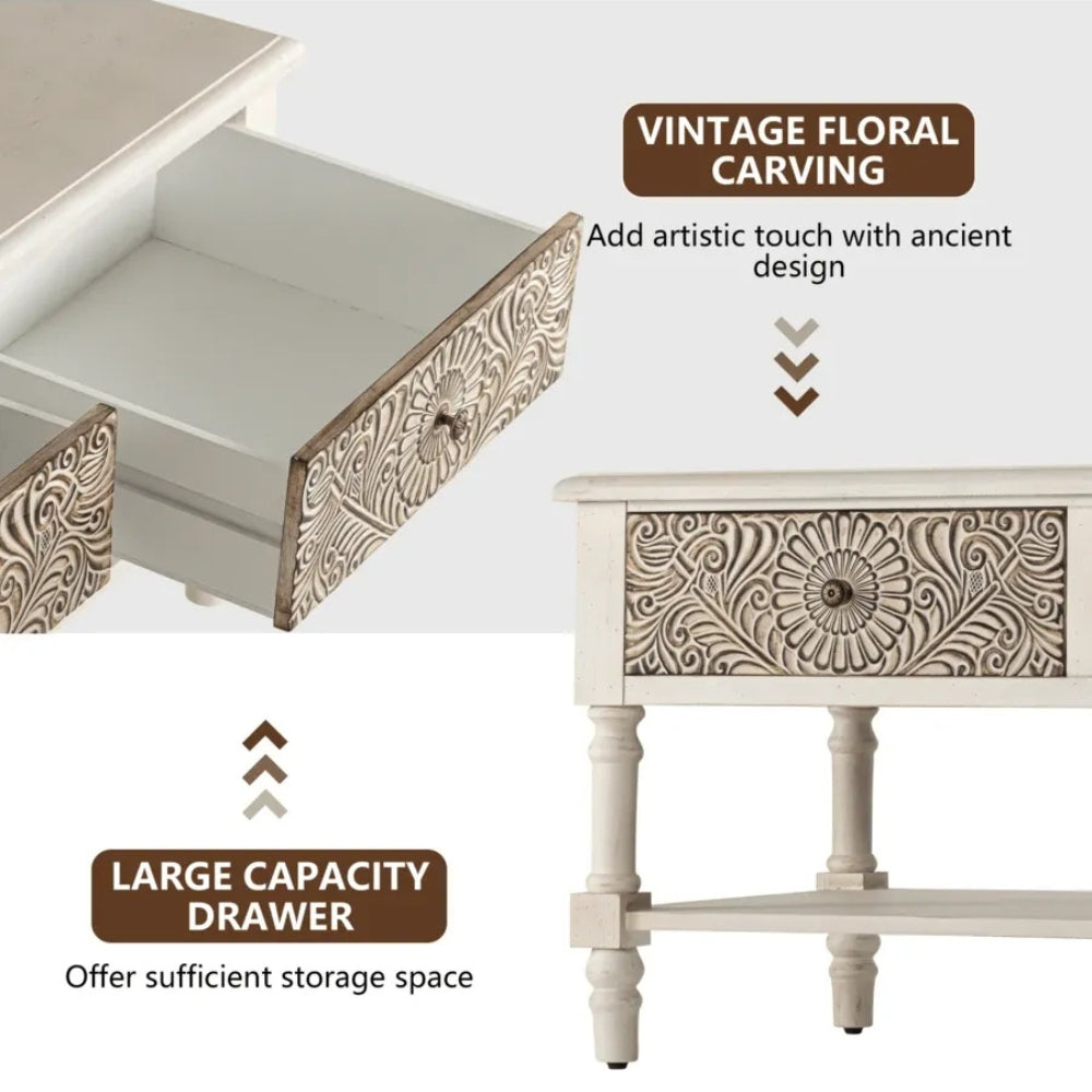 The vintage-inspired finish highlights the natural texture and character of the wood, making the table a perfect fit for bohemian, farmhouse, rustic, and classic interiors. Its spacious tabletop provides ample space for serving drinks, displaying décor, or placing books and magazines, while the two carved drawers offer convenient storage for small living room essentials.