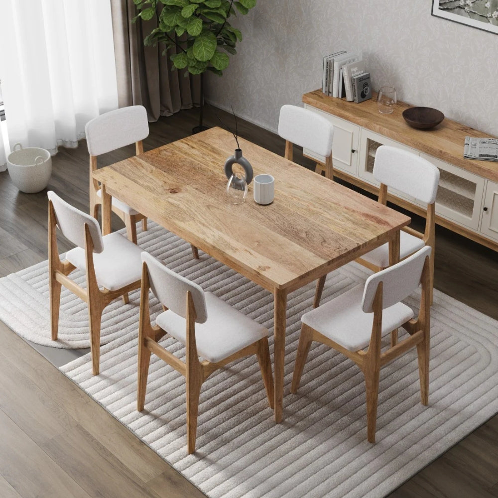 levate your dining space with the elegant Tatvaacasa 6-Seater Dining Table Set, thoughtfully designed to blend modern minimalism with timeless warmth. Crafted from high-quality solid wood, the dining table showcases a beautiful natural finish with rich wood grains that add sophistication and charm to any interior décor.