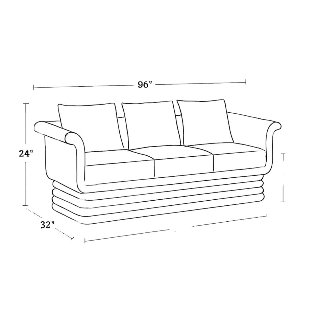 Its soft, flowing curves and generously wide armrests offer a welcoming, lounge-worthy feel, while the distinctive ribbed wooden base in matte black adds architectural depth and a grounded presence. Crafted for both style and comfort, this sofa comes with three plush back cushions and a spacious seating area, making it ideal for relaxing or entertaining guests.