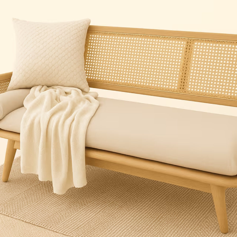 Featuring handwoven cane panels on the backrest and sides, it offers an airy, artisanal charm that enhances both comfort and style. The plush cushioned seat with bolster pillows invites you to unwind, making it perfect for lounging, reading, or hosting guests. Supported by mid-century inspired tapered legs, this versatile piece fits seamlessly into living rooms, sunrooms, or cozy corners.