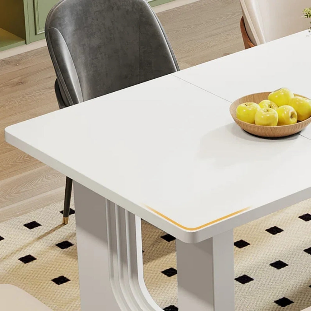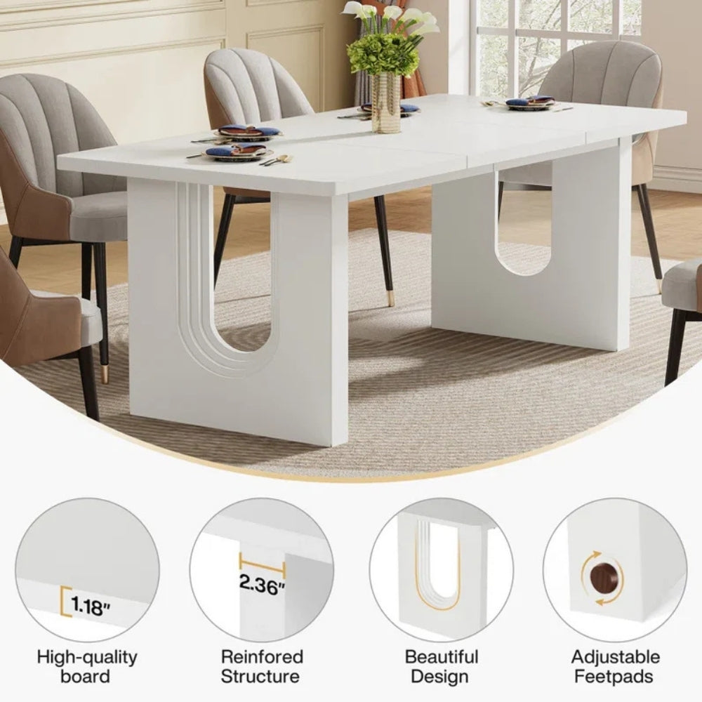 The reinforced structure ensures long-lasting stability, while the stylish U-shaped pedestal legs add a striking designer touch. Adjustable footpads keep the table stable on uneven floors and help protect your flooring from scratches. With a spacious tabletop, it comfortably accommodates family gatherings, dinner parties, or everyday meals.