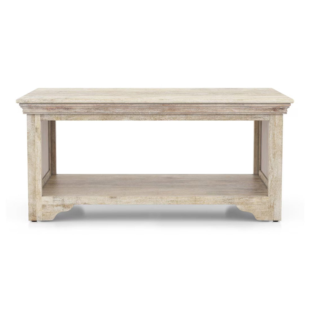 The rustic white finish enhances the natural texture of the wood while giving the table a soft, vintage-inspired character. Its clean lines and elegant proportions make it a versatile piece that complements farmhouse, coastal, rustic, and contemporary interiors. The spacious tabletop provides ample room for serving drinks, displaying decorative items, or keeping books and magazines within easy reach.