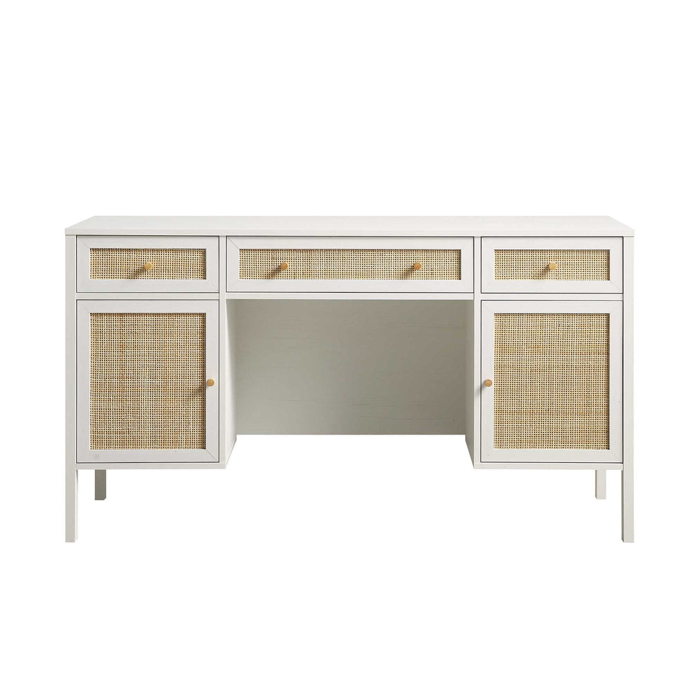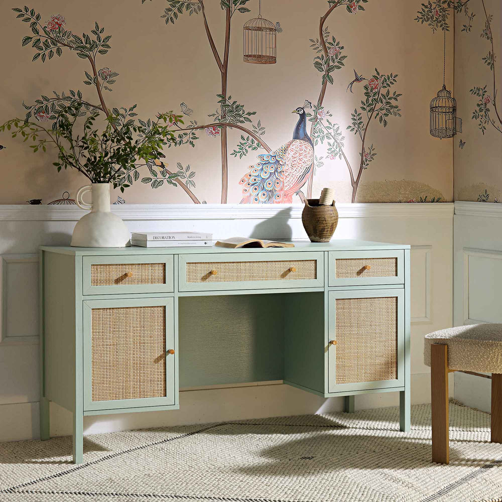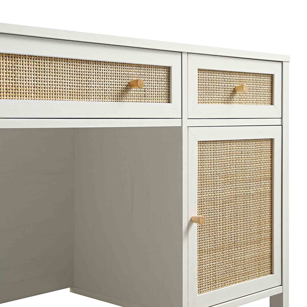 • Hand-woven rattan inserts on drawers and cupboard doors with coordinating solid wood handles and legs