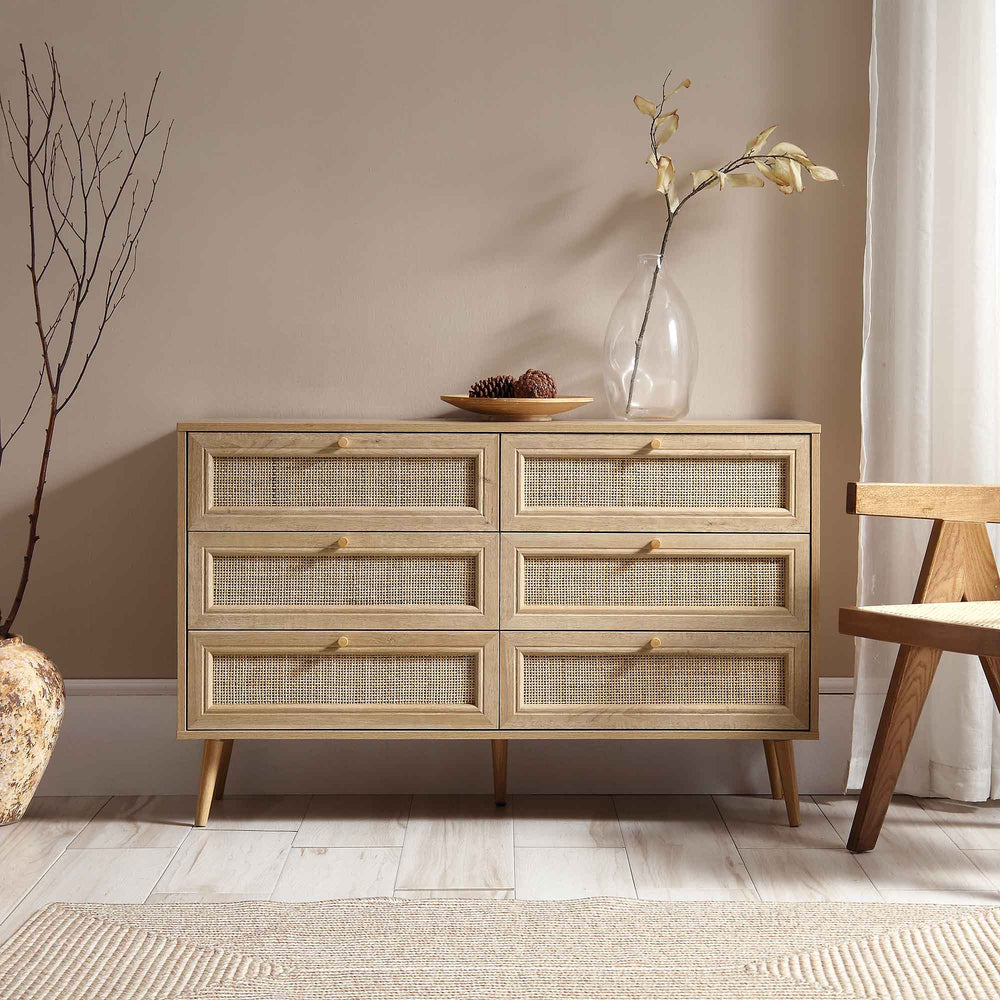 • Features 6 spacious sliding drawers with rattan fronts and solid wood handles