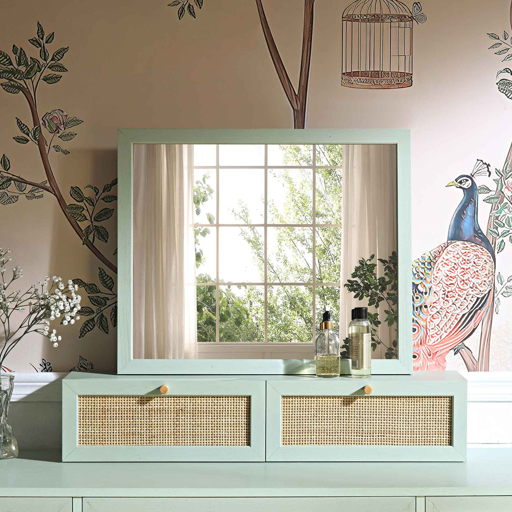 - Features a large mirror atop two spacious drawers for easy access to accessories and cosmetics
