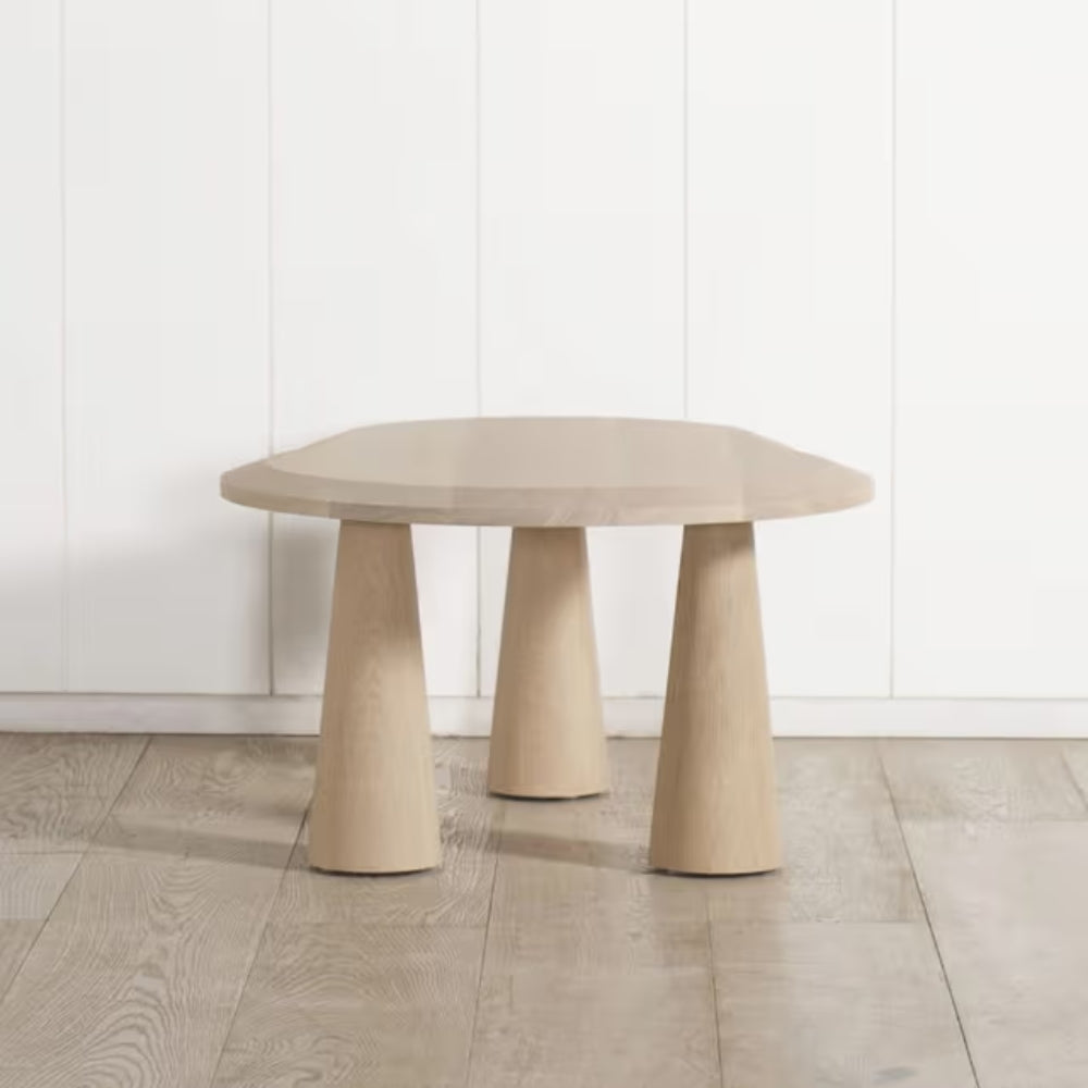 Expertly crafted from solid wood, the table is finished in a soft natural bleached tone that highlights the beauty of the wood grain while maintaining a light, airy aesthetic. The organic oval-shaped tabletop features smooth rounded edges, giving the table a gentle and inviting appearance that complements relaxed yet sophisticated living spaces.