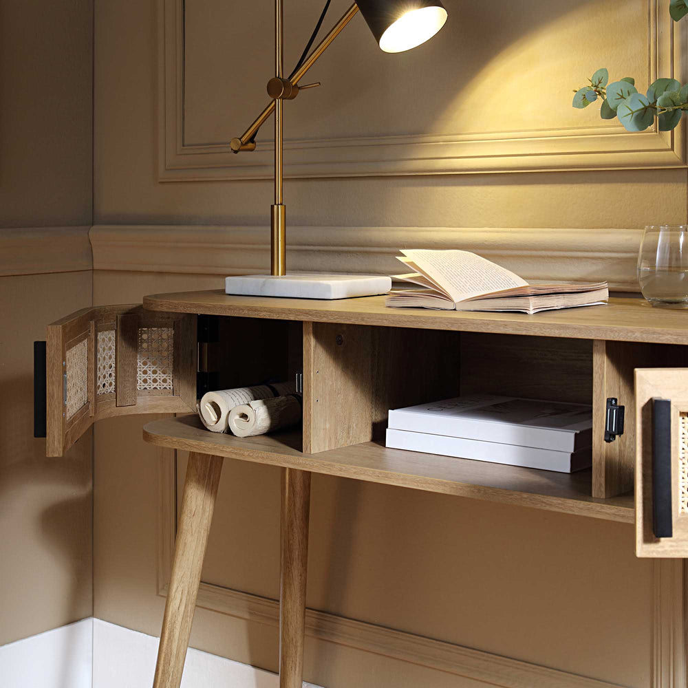 - Complete the look: Styled here with our Ophelia Ecru Boucle Chair, perfectly complementing the Regal Curved Rattan 2-Door Table.