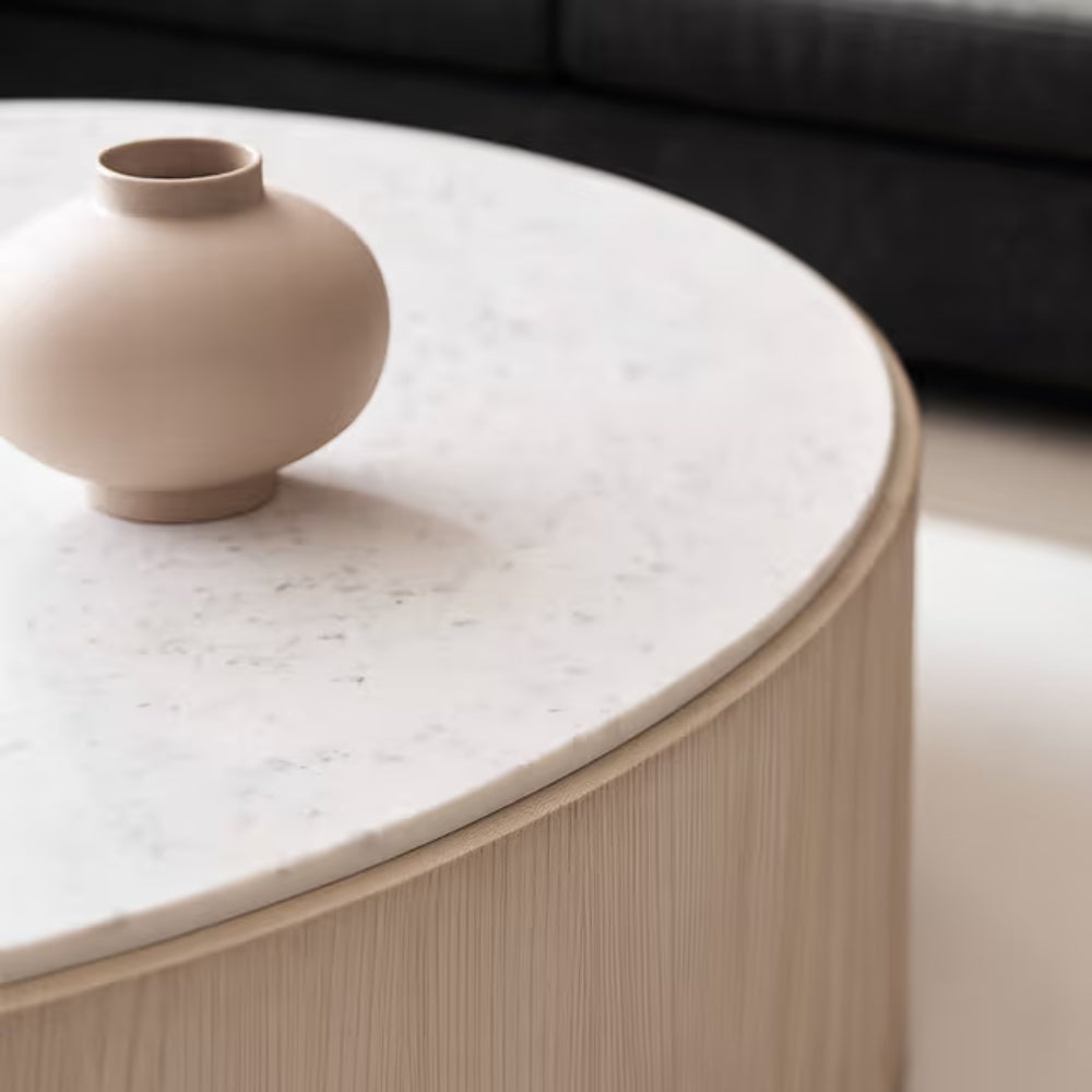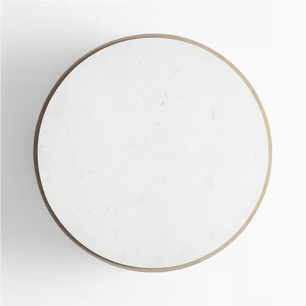 The Terra Marble Coffee Table blends natural warmth with timeless elegance. Its cylindrical base, crafted in a Sandstone Oak polish, showcases subtle wood grain textures that bring an organic charm to your space. The luxurious white marble top features delicate grey veining, offering a refined contrast against the soft, earthy tones of the base. Perfect as a centerpiece, this table complements both contemporary and classic interiors, bringing sophistication and serenity to any living room.