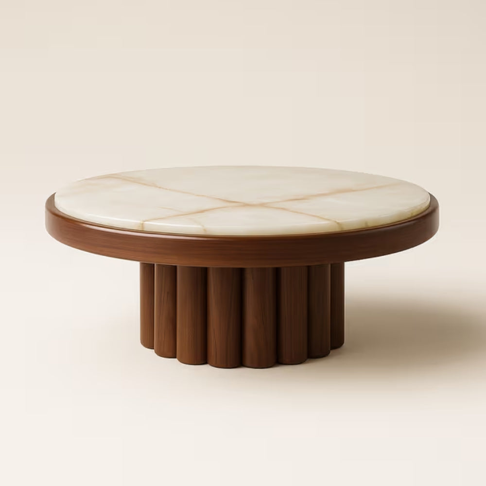 The base draws inspiration from classical architectural columns, with its seamless fluted design adding texture and visual rhythm. The contrast between the earthy walnut wood and luminous stone top creates a harmonious blend of warmth and sophistication, making it a perfect centerpiece for modern and luxury interiors.