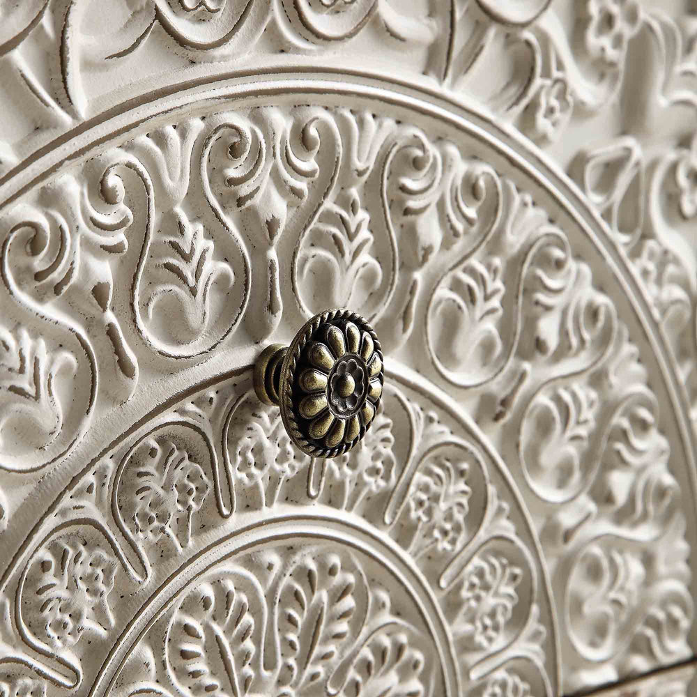 • Features carved drawer fronts paired with flower-pattern antique brass handles for a boho-chic aesthetic