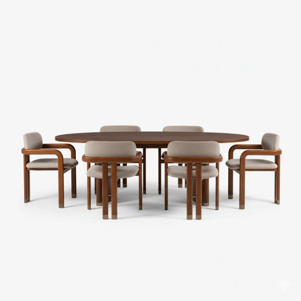 The spacious rectangular tabletop offers ample room for family meals, festive gatherings, and everyday dining, while the smooth, warm-toned wood finish adds a touch of luxury to any interior. The sturdy wooden legs ensure excellent stability and long-lasting durability. Complementing the table, the cushioned chairs are crafted for superior comfort with gently curved armrests and a supportive backrest, making long dinners more enjoyable.