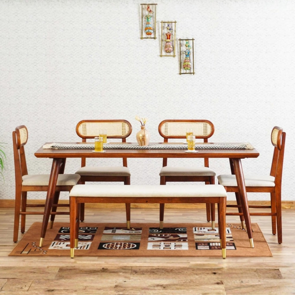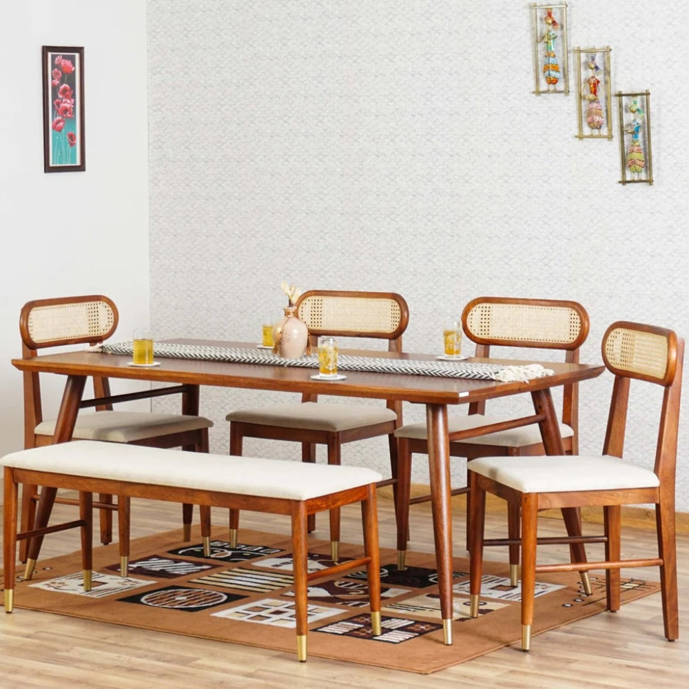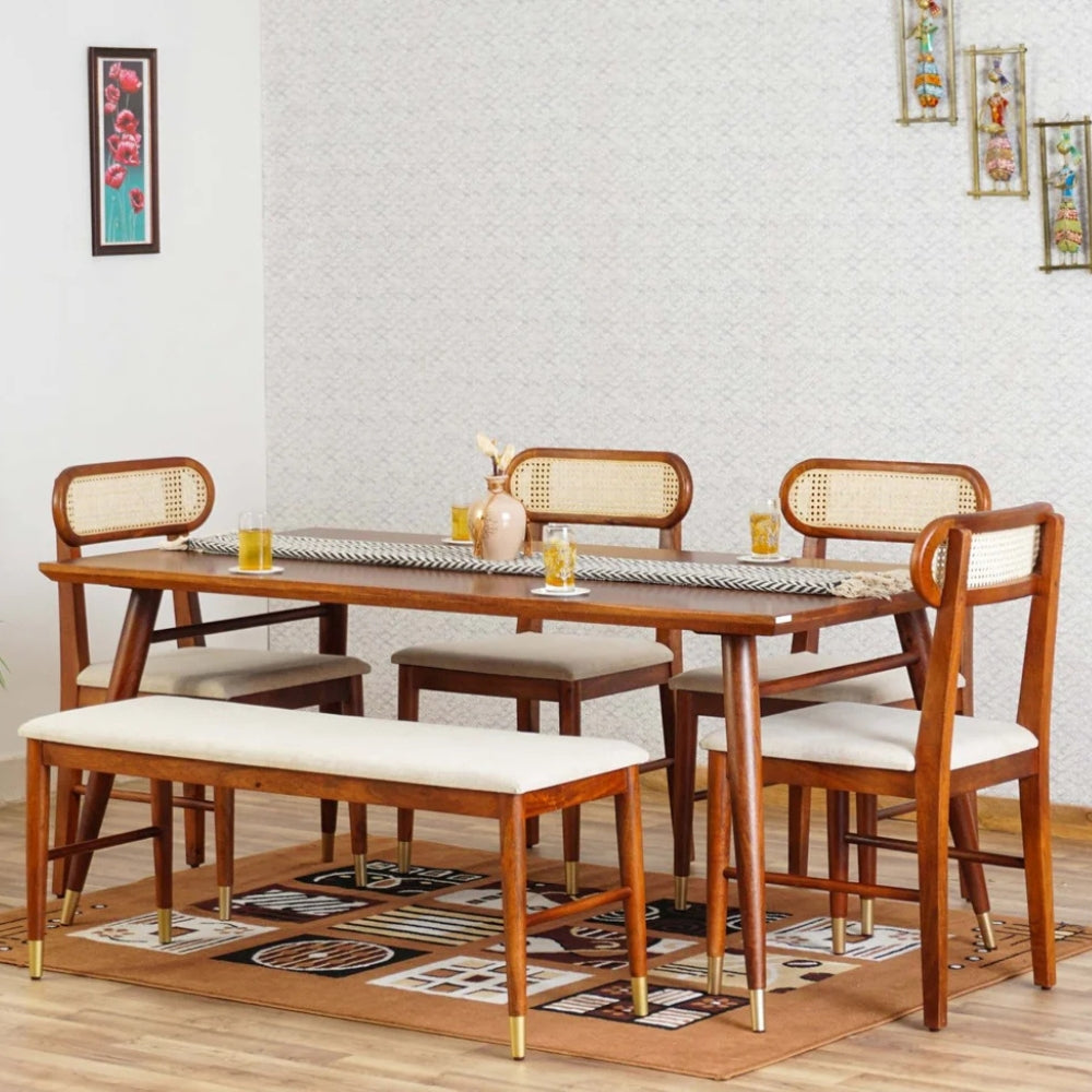 The natural wooden finish enhances the warmth of your interiors, while the stylish Rattan Cane backrests add a modern yet classic charm. Soft cushioned seats ensure exceptional comfort, making every dining experience relaxing and enjoyable. Built with strong, sturdy legs and a sleek design, this dining set is perfect for contemporary, modern, and traditional homes alike.