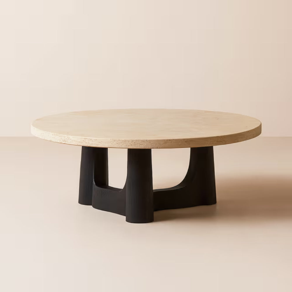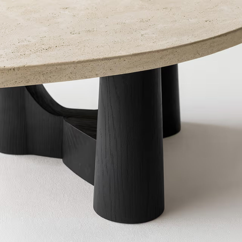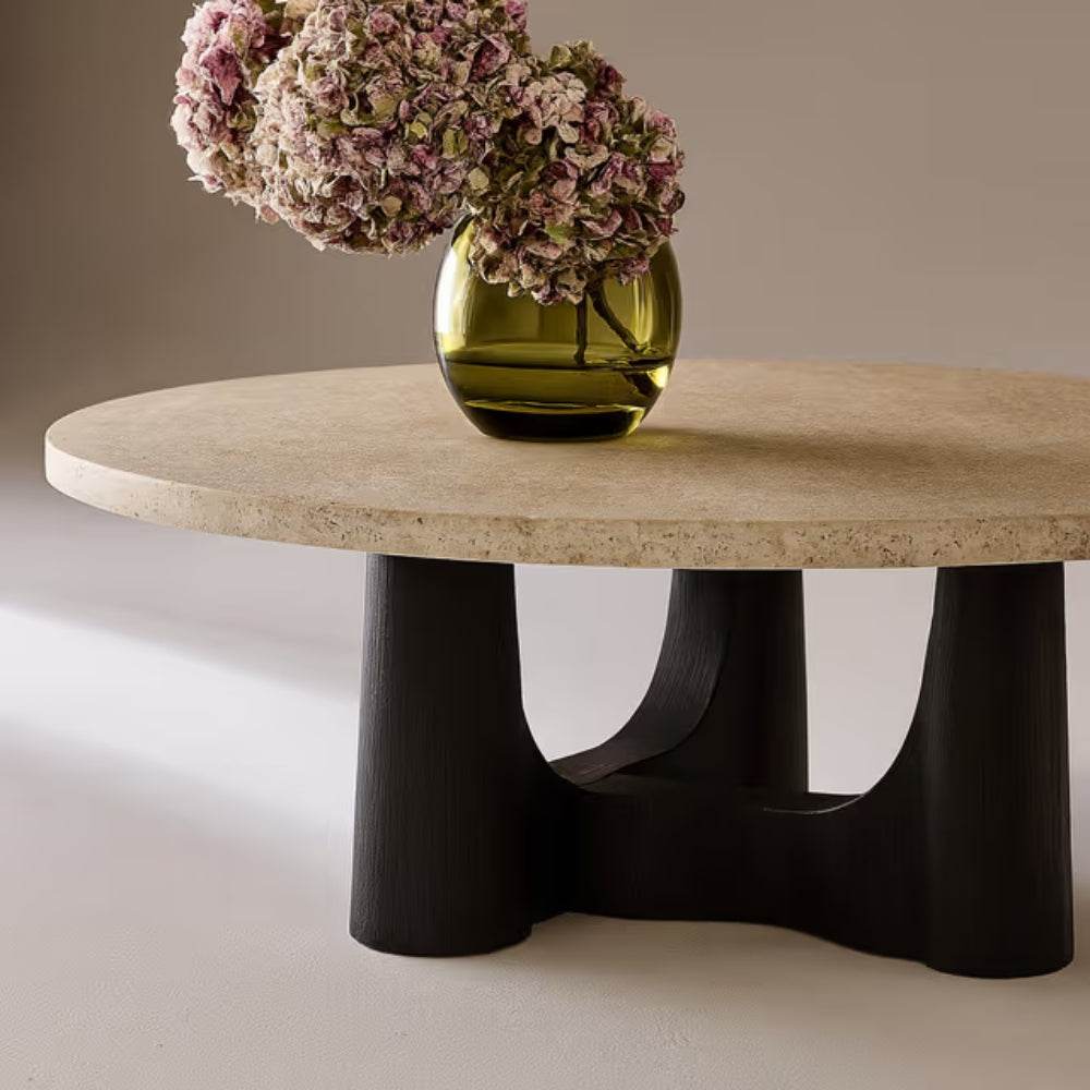 Supporting the stone top is a sculptural solid wood base finished in deep charcoal black, offering a bold visual contrast against the light stone surface. The matte wood finish highlights the natural grain while adding depth and contemporary character. With its sculptural silhouette and balanced proportions, the Caldera Coffee Table anchors the room with a grounded yet modern presence.