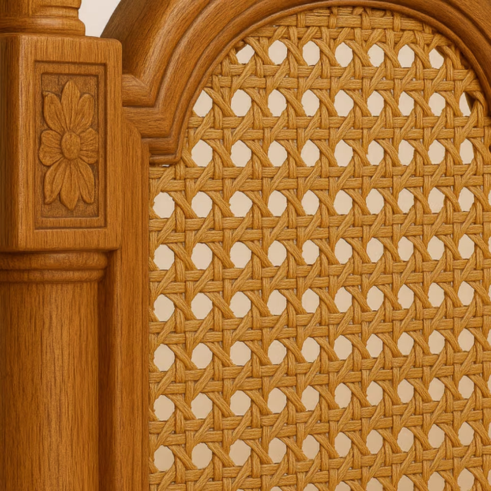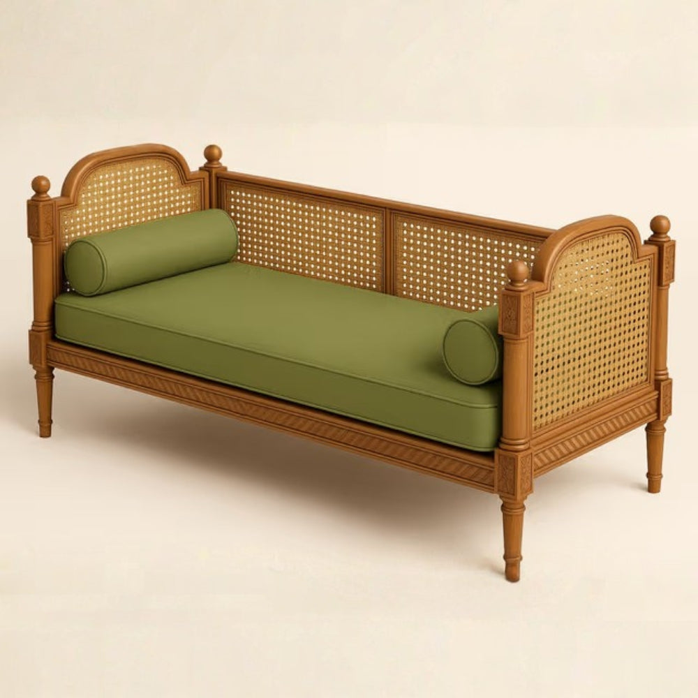 Crafted from premium kiln-dried solid wood, the frame features traditional Marwari floral carvings that reflect timeless artistry. The woven rattan cane panels on the back and sides add breathability and a light, organic feel, while the high-density cushioned seat with bolster pillows ensures exceptional comfort for everyday lounging.