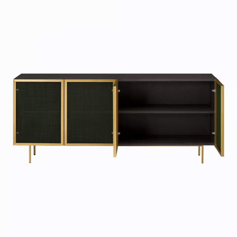 Elevate your interiors with the sophisticated charm of the Olive Luxe Cabinet by Tatvaacasa. Designed as a true statement piece, this elegant cabinet features deep olive mesh doors framed in warm brass, creating a striking balance of texture and luxury. The rich dark wood body enhances the contrast, adding depth and timeless appeal to any space.