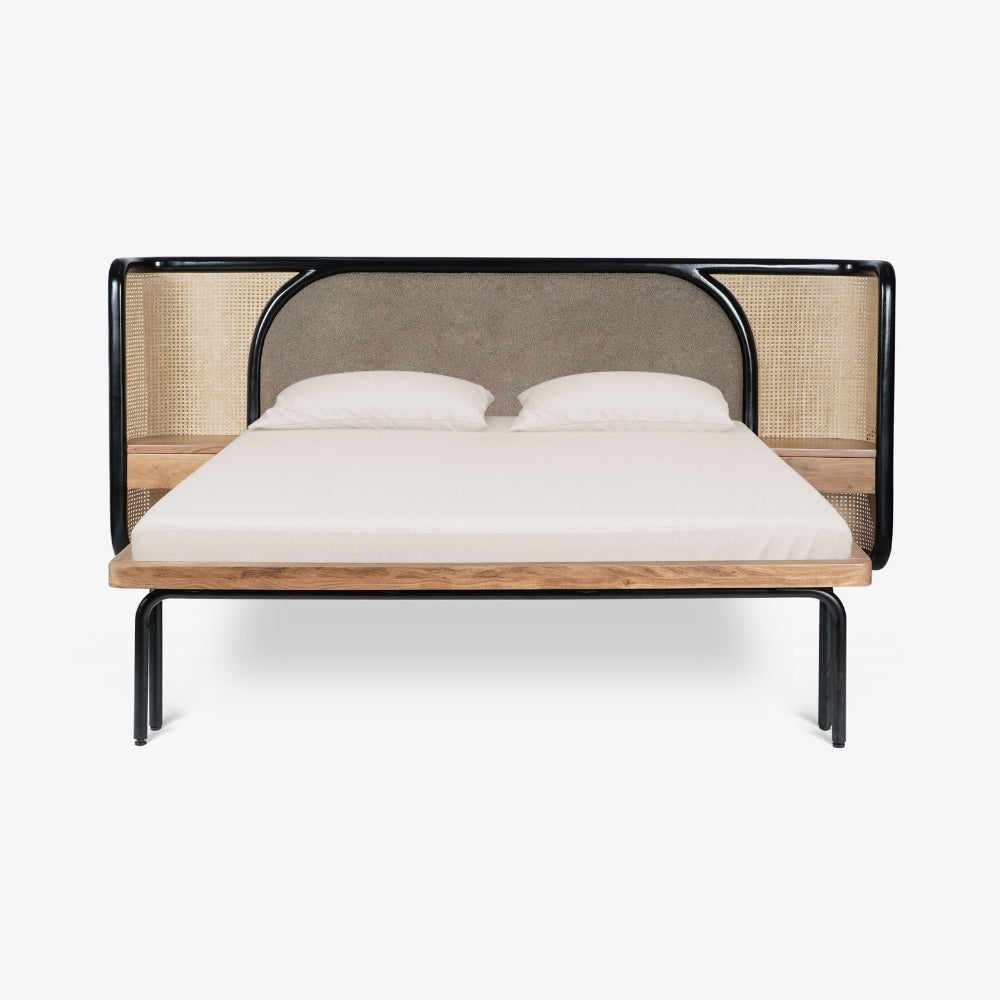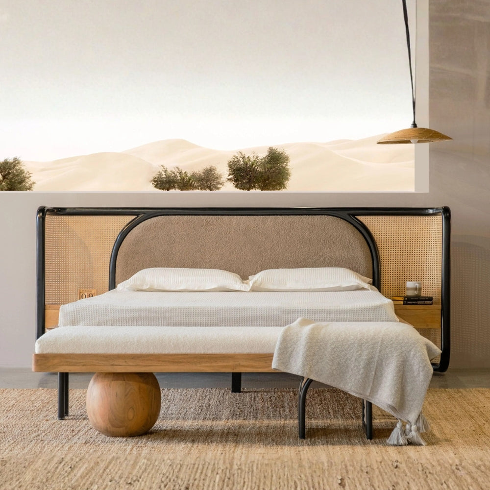 Crafted from premium Acacia wood and supported by a robust base of wooden slats, this queen-size bed offers excellent mattress support and everyday comfort. The rich natural wood finish, paired with black powder-coated metal and woven cane detailing, creates a sophisticated contrast that complements modern, urban, and resort-inspired interiors alike.