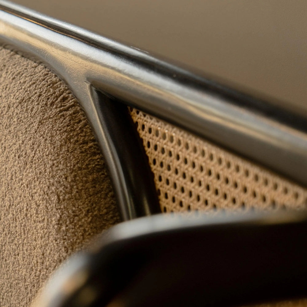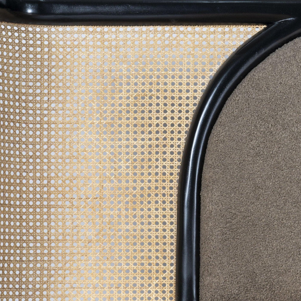The sturdy black metal frame wraps seamlessly around the headboard and base, lending a sleek industrial edge while ensuring long-lasting structural strength. At the center of the headboard, a soft upholstered panel provides comfortable back support for relaxed lounging, while the surrounding natural rattan cane webbing adds an artisanal, airy charm and visual depth.