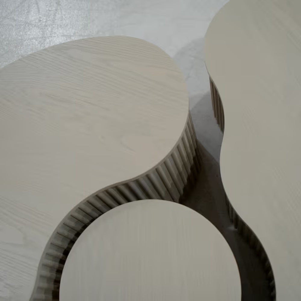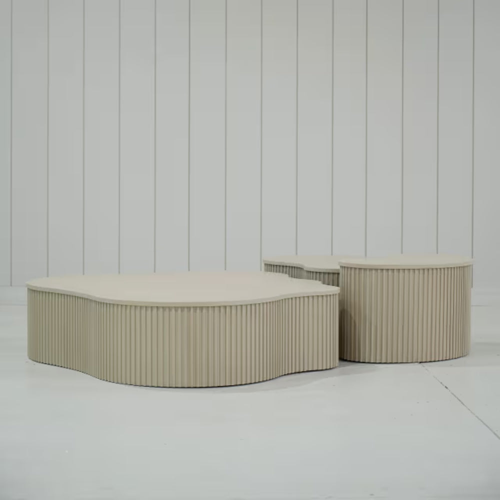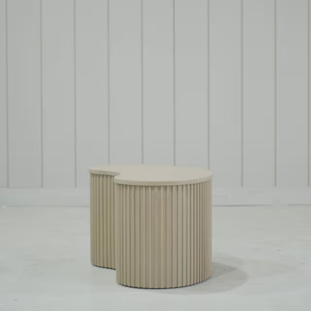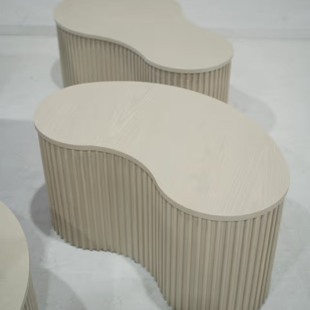 Expertly crafted from premium quality wood, each table showcases a soft neutral finish that highlights the natural beauty of the material while complementing a wide range of interior styles. The unique curved forms bring a sense of movement and softness to the design, while the textured fluted bases add depth and architectural character.