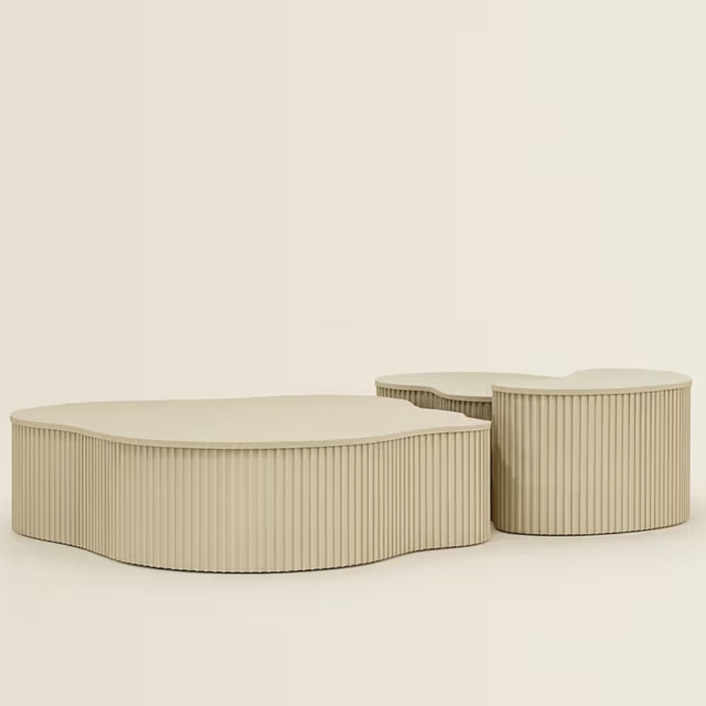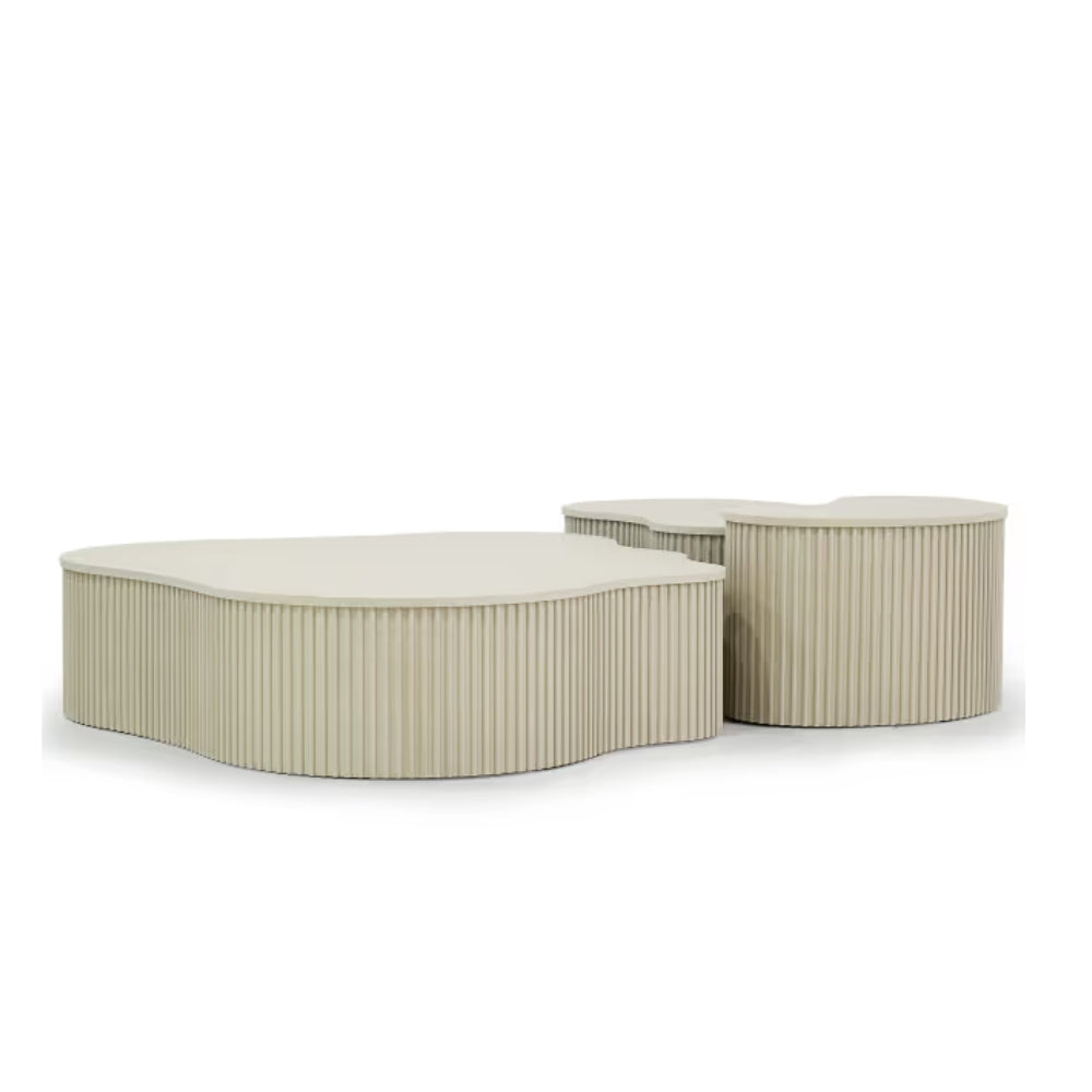 Add sculptural elegance and modern functionality to your living space with the Tatvaacasa Nest Coffee Table Set. Designed with organic inspiration, this stylish set features fluid kidney-shaped tabletops paired with fluted cylindrical bases, creating a visually striking centerpiece that blends art with everyday usability.