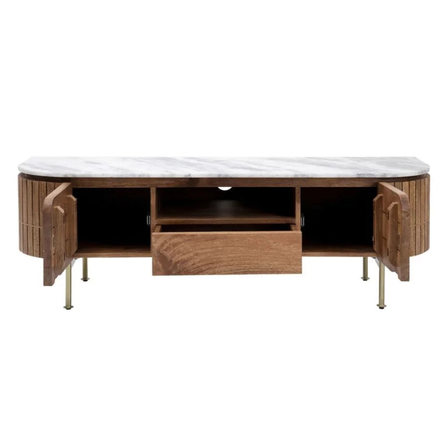 Designed to balance style with practicality, this TV unit offers a spacious and sturdy surface for your television while providing ample storage to organize media devices, set-top boxes, gaming consoles, books, and décor accents. The solid wood construction ensures strength and durability for long-term everyday use, while the smooth marble top adds a luxurious, easy-to-clean surface that elevates your entertainment area.